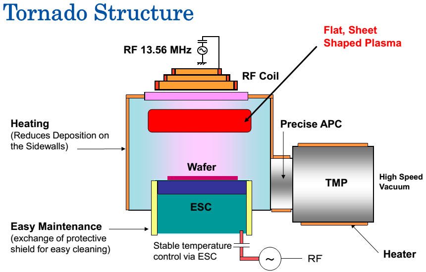 При создании таких устройств как светодиоды или мощные транзисторы все более актуальным стоит вопрос снижения потребляемой энергии. Микропроизводство сложных полупроводников, из которых и создают такие устройства все сменьшими параметрами по потреблению требует очень точных процессов травления. Системы травления с индуктивно-связанной плазмой используют в 1000 раз более плотную плазму чем обычные установки реактивно-ионного травления с электродами параллельного типа и способны работать в более широком диапазоне давлений и потоков газов. Но главной трудностью является получение высоко однородной плазмы в ICP установках травления. SAMCO разработала и запатентовала ВЧ катушку, которая была названа Tornado ICP® с 3-х размерной структурой. Катушка Tornado намотана в виде конуса и позволяет формирование высоко плотной плазмы.