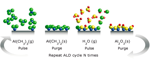Метод атомно-слоевого осаждения (ALD) является довольно новым технологическим процессом, обеспечивающим рост тонких пленок высокого качества на подложках любой геометри. Особенностью метода является формирование молекулярного или атомарного монослоя без образования трехмерных зародышей. Суть метода заключается в постоянной подаче инертного газа-носителя в камеру-реактор и раздельному попеременному введению газообразных реагентов в этот поток так, что химические реакции, приводящие к росту пленок, протекают только в хемисорбированных слоях, то есть с исключением реакций в газовой фазе. Таким образом цикл процесса осаждения атомных слоев состоит из кратковременной подачи первого прекурсора, продувки инертным газом, затем кратковременной подаче второго прекурсора и последующей продувки. За один цикл создается один монослой пленки, из-за этого толщина плёнки легко и очень точно задаётся и контролируется по количеству циклов осаждения.